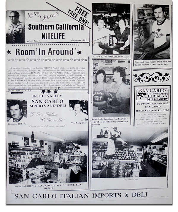 Giovanni first worked as an electronic technicialn for ITT in the early 70’s, then at the Broadway in Panorama City Mall, serving cheese and wine in the gourmet shop. In March of 1975, Giovanni purchased the local “San Carlo Deli” and kept the name.